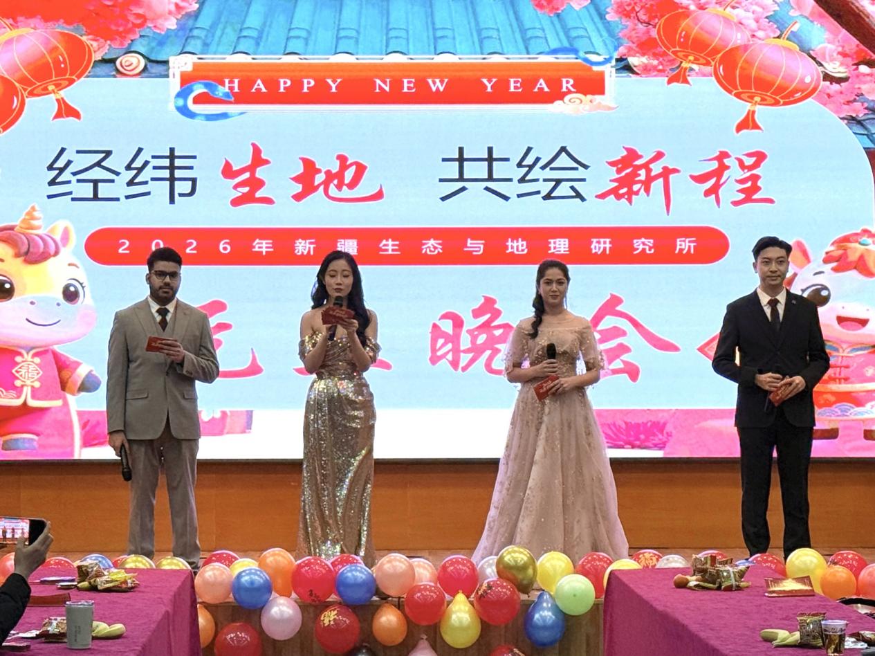 马年新岁春光至,欢声笑语满堂间。骏马扬蹄追梦远,青春奋进耀华年。为营造积极向上、团结和谐的创新文化氛围,展现新时代科研工作者与青年学子的精神风貌,2025年12月30日下午,中国科学院新疆生态与地理研究所全所师生在行政楼二楼报告厅欢聚一堂,成功举办2026年“经纬生地,共绘新程”研究生元旦联欢晚会。本次晚会由研究所研究生教育处、研究生党总支及研究生会联合筹办,旨在通过文艺汇演的形式,深化师生情感交流,凝聚奋进共识,激发全所上下以更加饱满的热情投身新一年的科研创新与事业发展之中。
